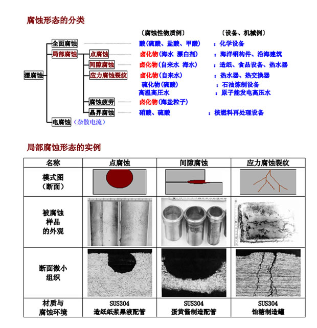 如上所述,不銹鋼通過(guò)在表面形成鈍態(tài)保護(hù)膜,而具有卓越的耐蝕性,但由于環(huán)境影響,其中被 破壞的部分金屬溶解集中進(jìn)行,形成局部腐蝕。其中,讓人擔(dān)心的腐蝕是與氯化物離子(Cl- )有關(guān)的局 部腐蝕,特別在蝕坑處產(chǎn)生“點(diǎn)腐蝕”、在間隙結(jié)構(gòu)處產(chǎn)生“間隙腐蝕”、因焊接等殘余應(yīng)力的部位容 易產(chǎn)生“應(yīng)力腐蝕裂紋(SCC)”。這些腐蝕主要與氯等鹵化物離子有關(guān),因電氣化學(xué)的反應(yīng)而產(chǎn)生、擴(kuò) 大腐蝕。
